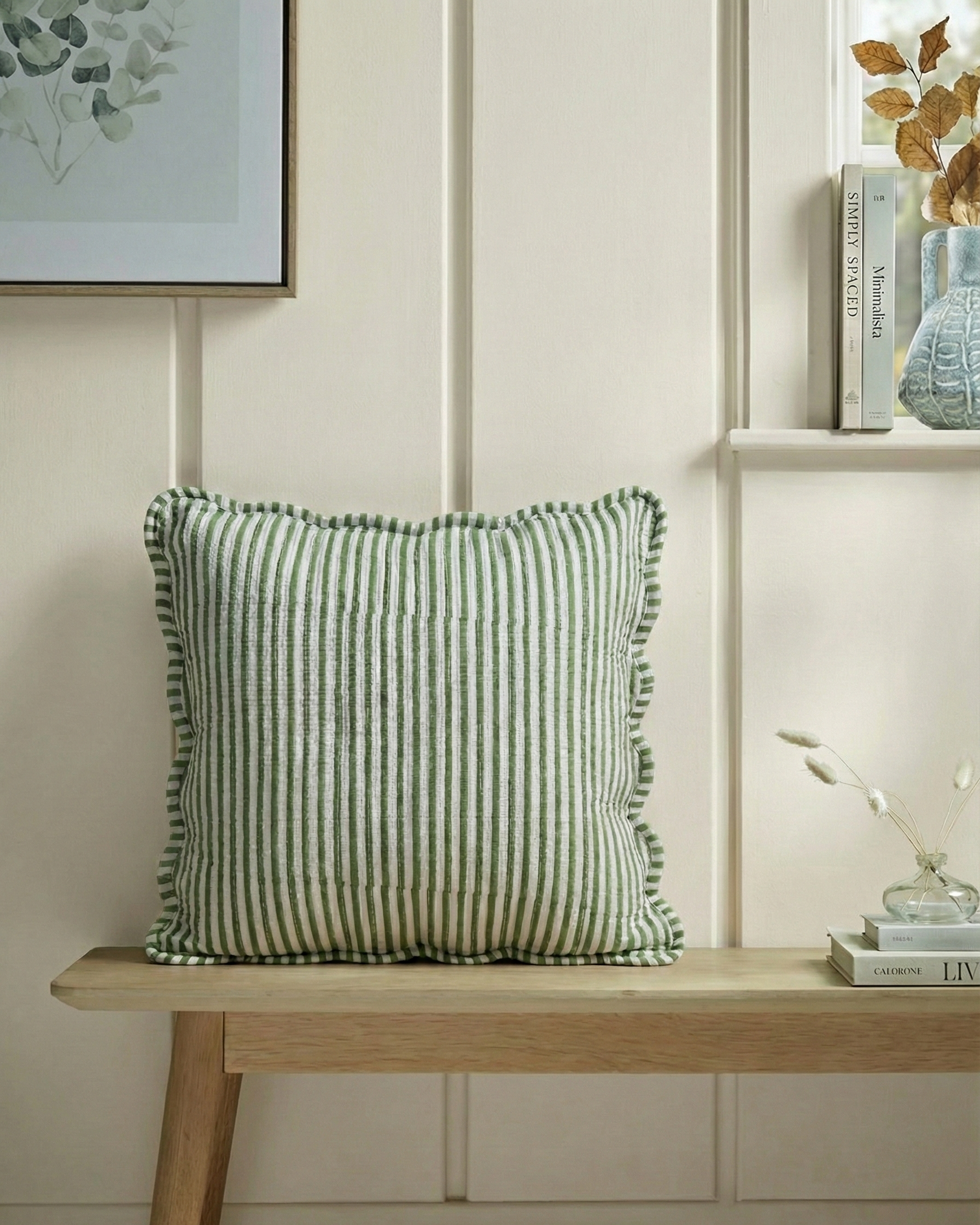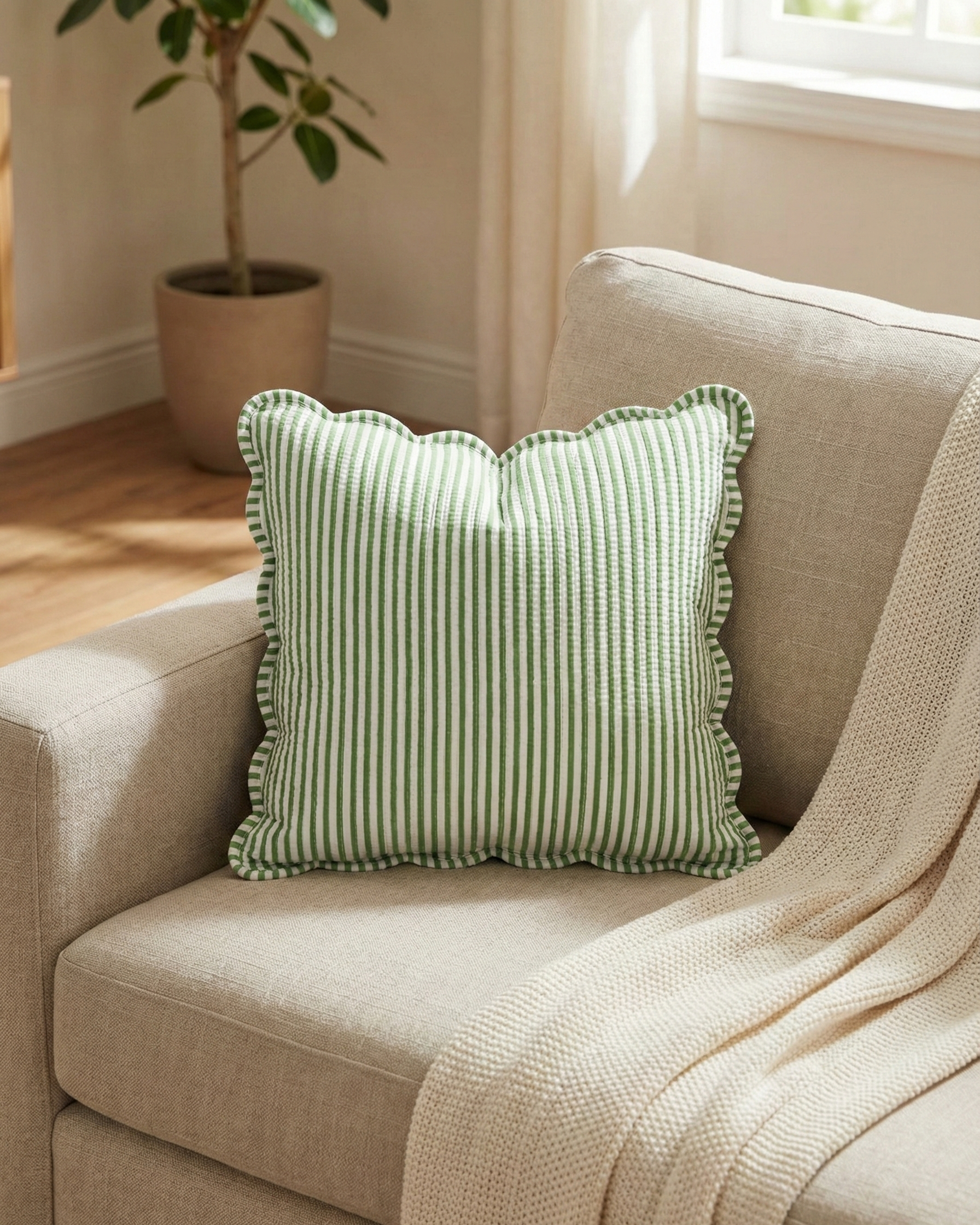 Matcha Wave Scalloped Cushion Structured stripes meet whimsical curves. This cover features crisp verdant lines softened by a playful scalloped border and tactile channel stitching. Designed to break up rigid silhouettes, it adds a breath of nature and organic movement to refined interiors.