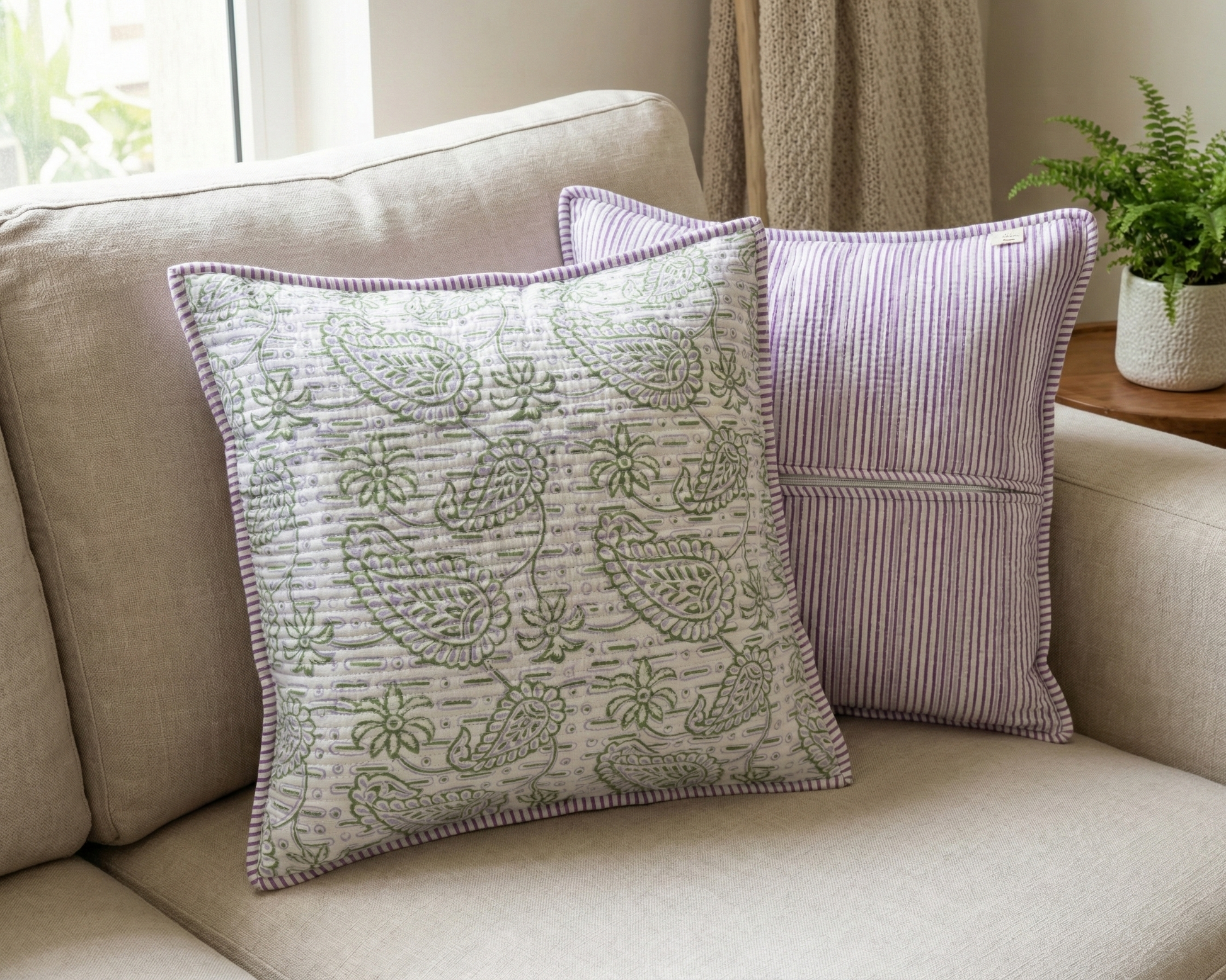Switch effortlessly between organic sage paisleys and crisp lavender stripes. Violet Vines combines artisanal texture with a refined colour palette, making it an ideal choice for layering in curated spaces. Finished with striped piping for a cohesive edge, it is the perfect accent for layering texture into living spaces or bedrooms.