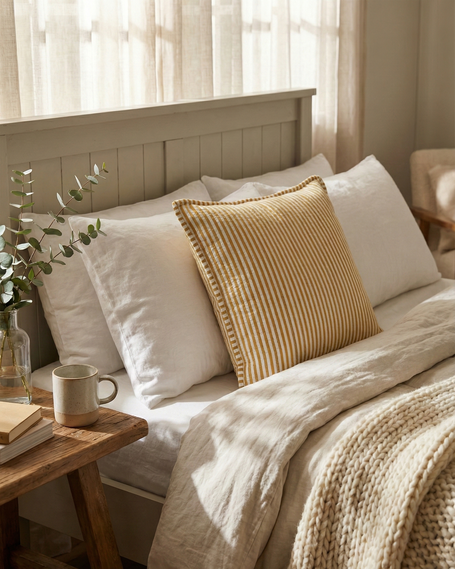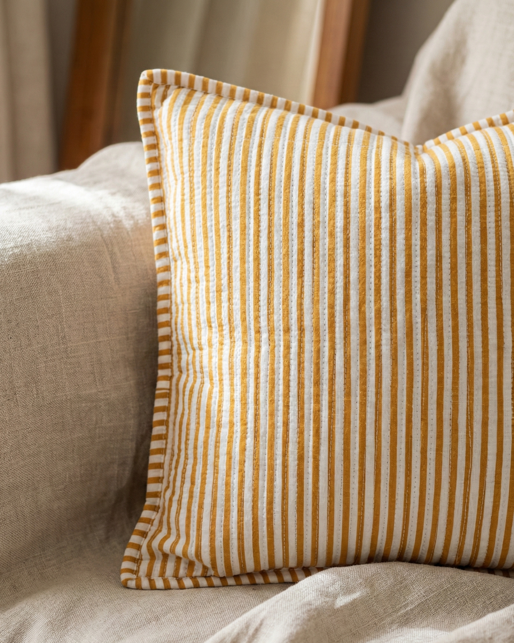 Hand-stitched quilting meets a sophisticated ochre palette. This Golden Hour cover offers immediate textural depth and a bespoke finish. Designed to look effortlessly collected, this cover brings a relaxed, high-end narrative to your sofa.