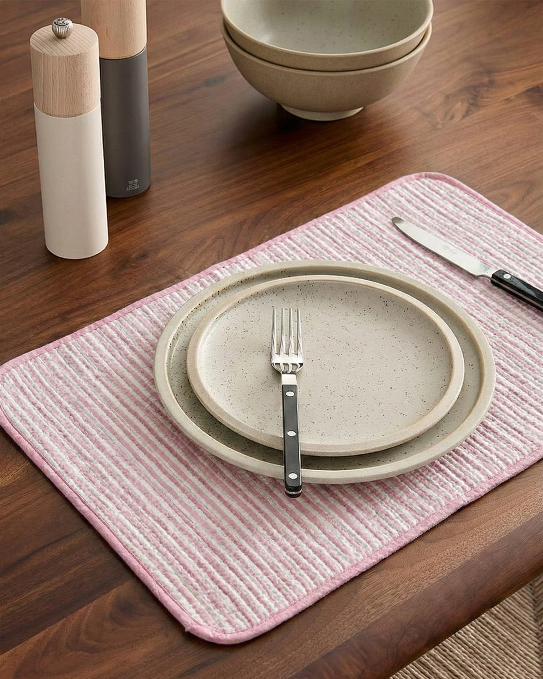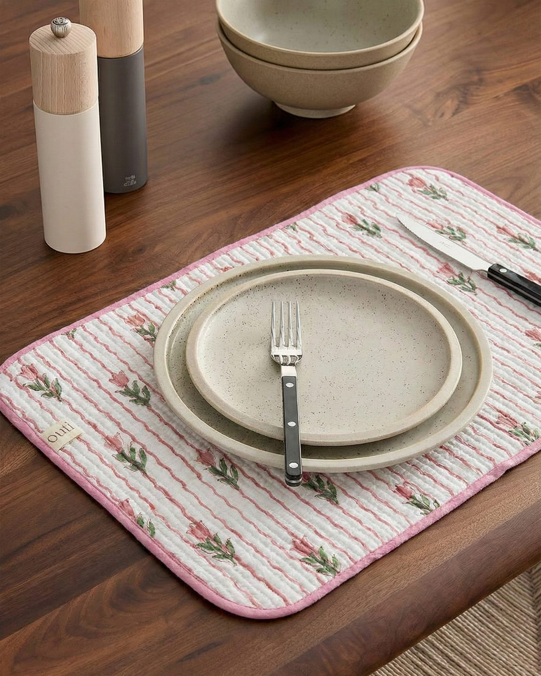 Experience the intersection of comfort and couture. Our Pretty In Pink reversible placemat features a rhythmic linear quilt that catches the light, bringing a subtle, luminous quality to your dining space. Soft to the touch yet structured in form, it provides an elevated backdrop for the most refined dinnerware.