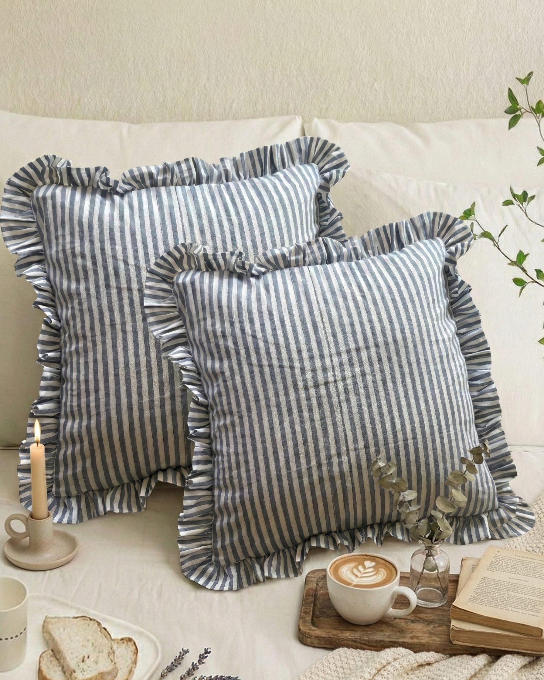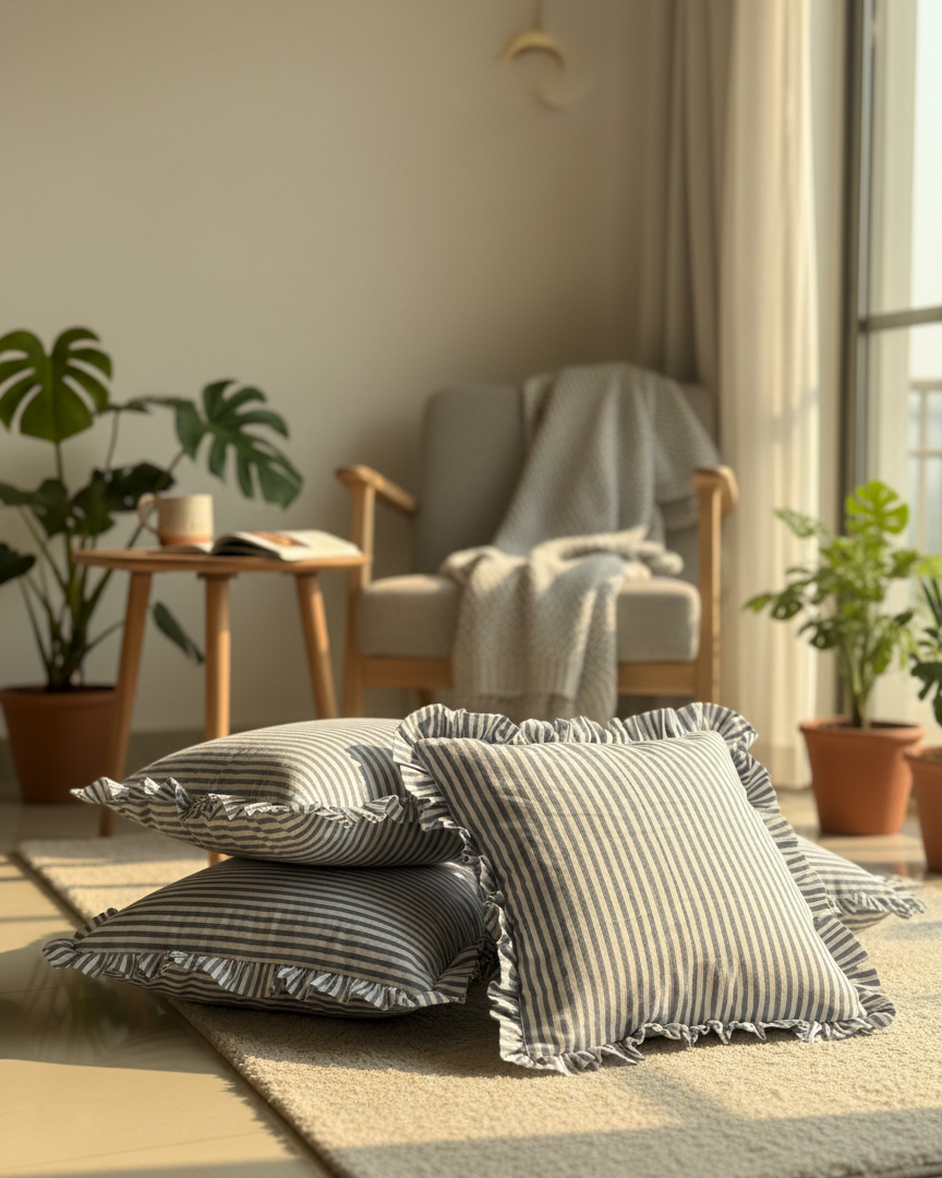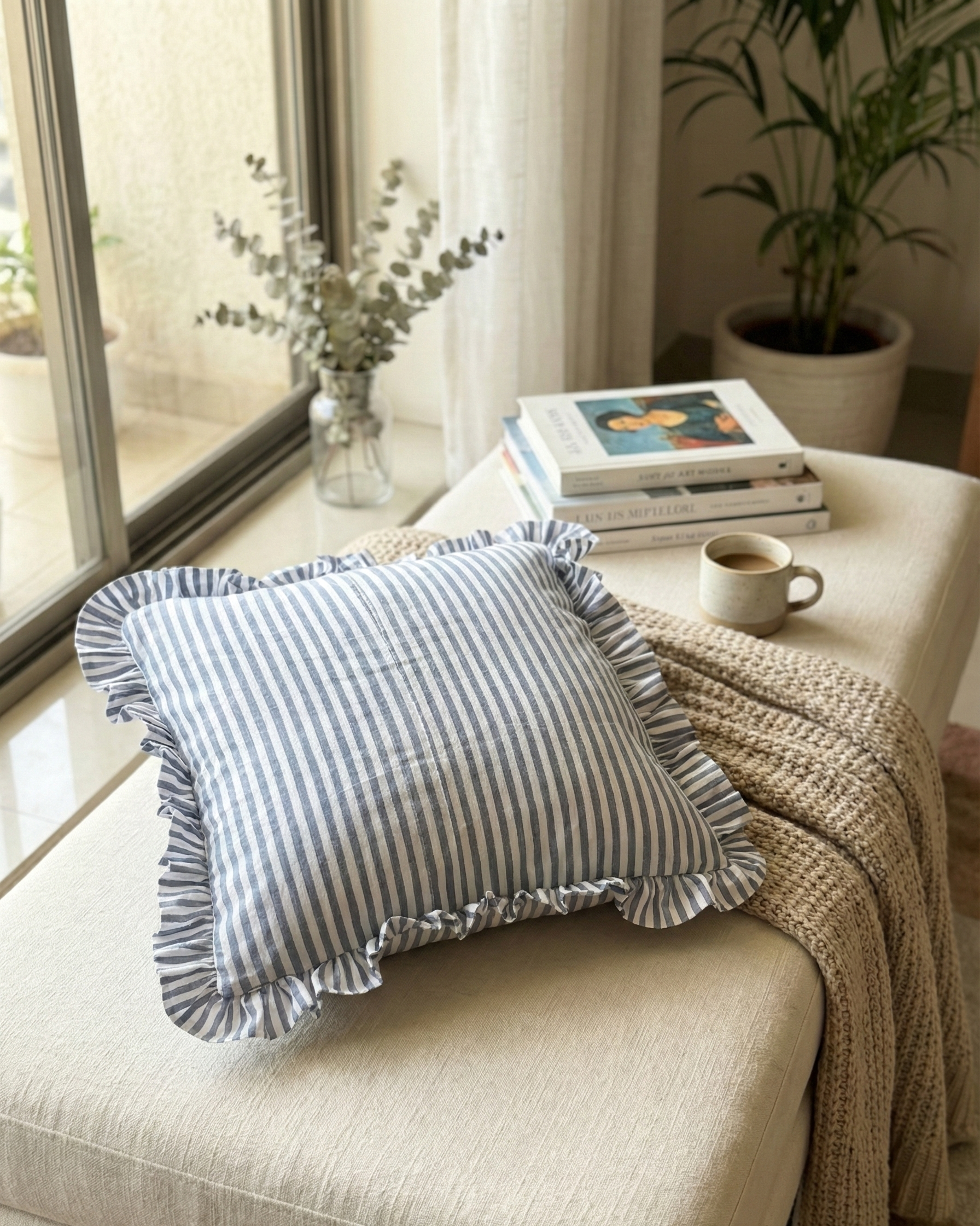Drift Away on the Cloud Line. Softness you can see and feel. This Cushion Cover pairs the structured elegance of vertical ticking stripes with the ethereal charm of a ruffled border. It is the ultimate "blender" piece—versatile enough to pair with heavy velvets in winter or breezy linens in summer.